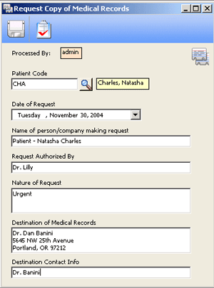 The screen shot below shows how MedOffice tracks all requests for medical records that are sent out a provider’s office, a HIPAA requirement.
